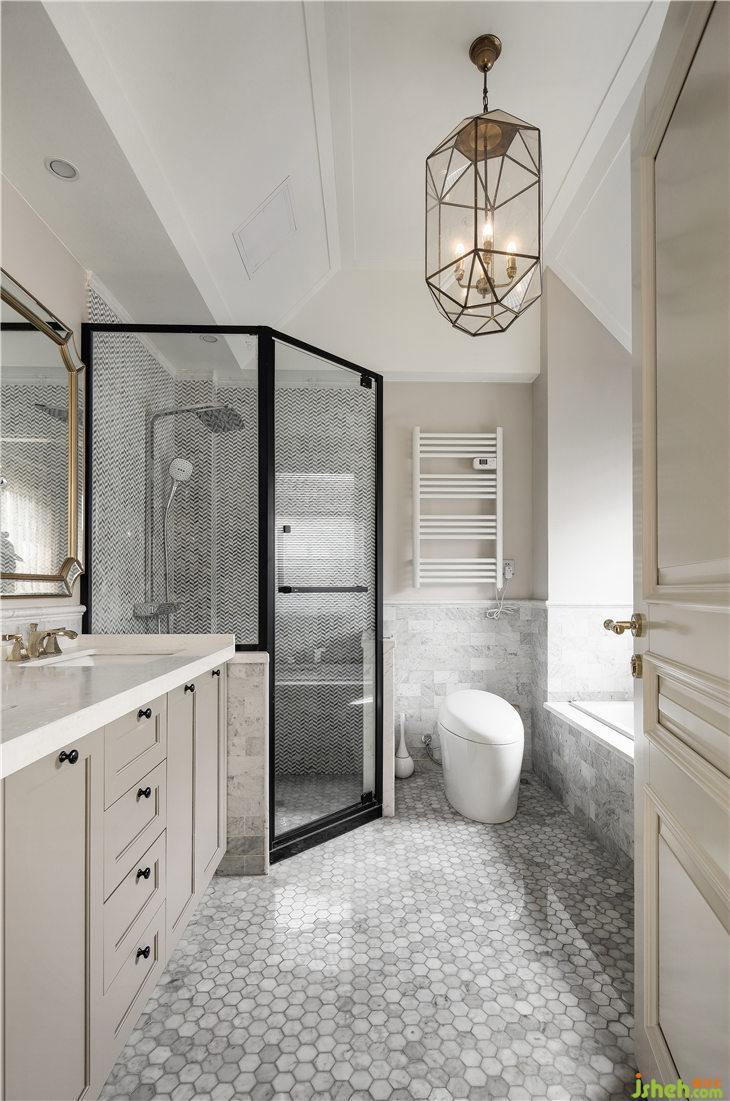 主臥衛(wèi)生間延續(xù)二樓客衛(wèi)手法,地面,選用了淺色六邊形馬賽克大理石地磚,墻面同色長形小磚,整體色彩、材質(zhì)統(tǒng)一和諧。淋浴房墻面背景,選用小紋理的馬賽克磚,質(zhì)感細(xì)膩。