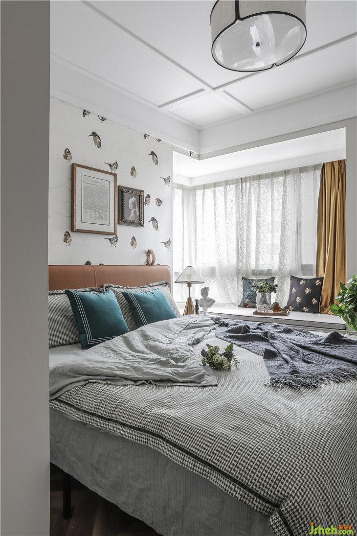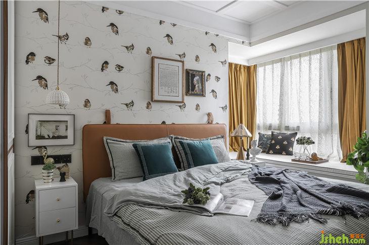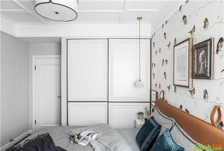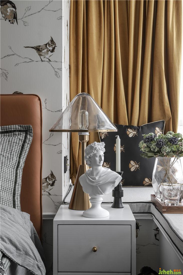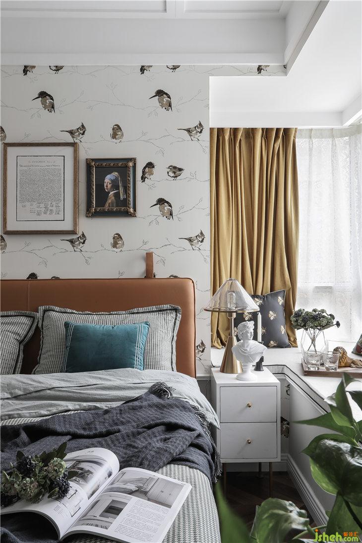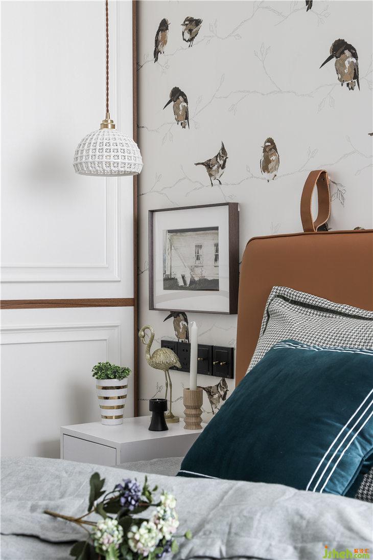 背景是一幅珠光質(zhì)感的花鳥壁紙,床頭非對(duì)稱的復(fù)古裝飾畫美麗別致,增添了空間的靈動(dòng)趣味。