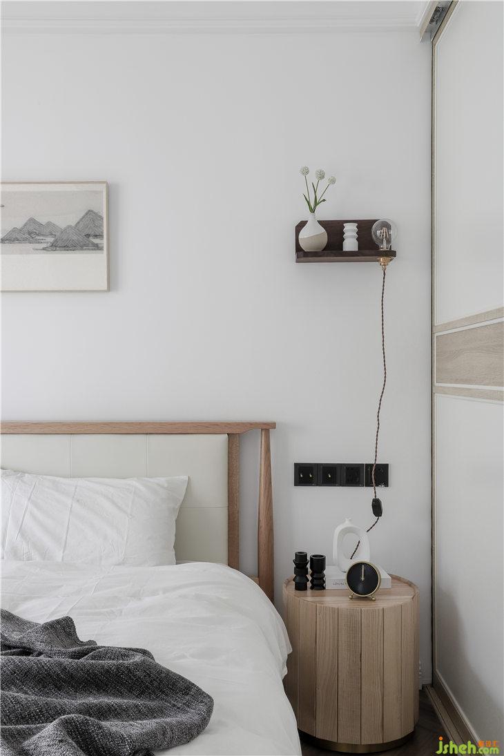 床頭的另一側(cè),我們?cè)O(shè)計(jì)了一個(gè)可控制燈光亮度的床頭燈,這樣很方便老人夜間使用,床頭柜則是一個(gè)完全收納式的,放置一些小的物件。