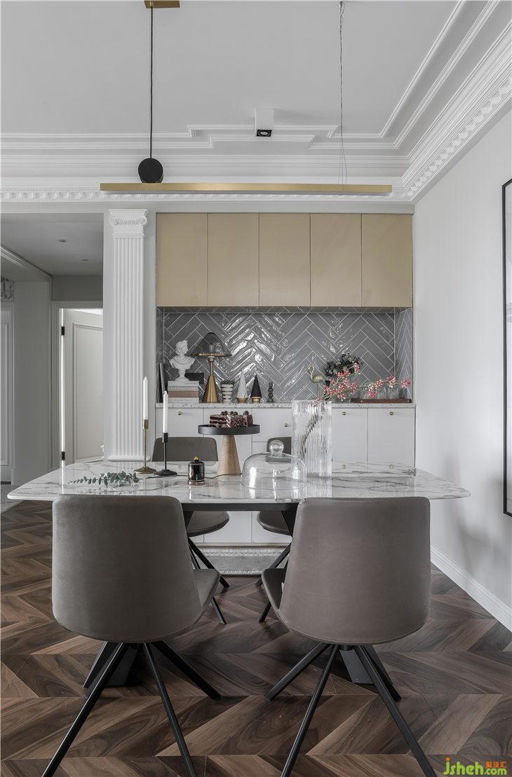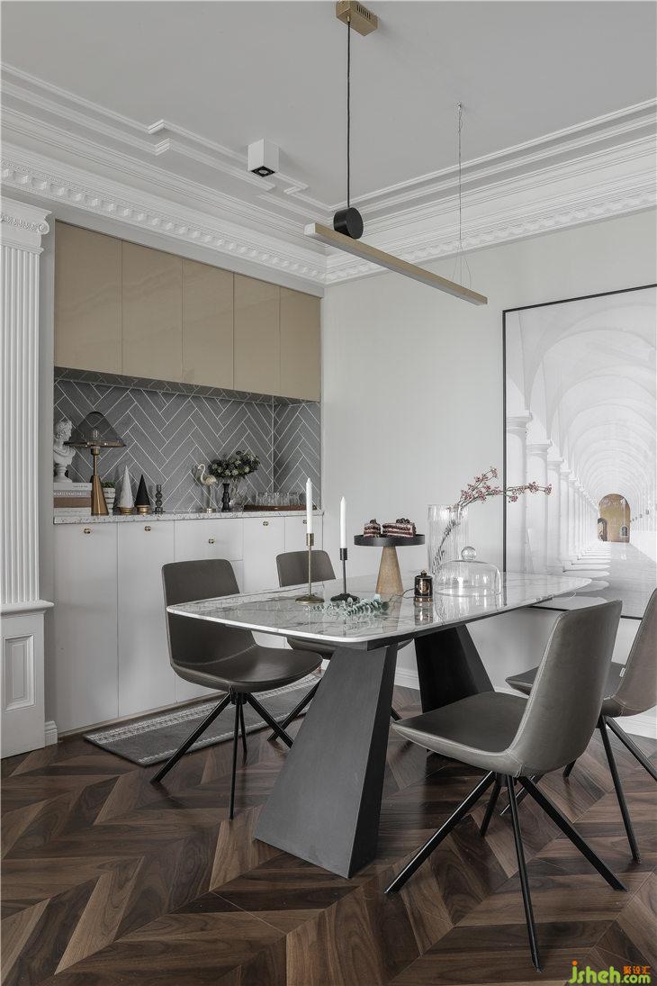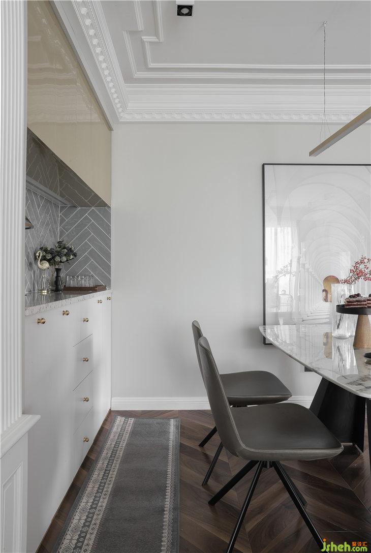 打開入戶門,就是我們的餐廳空間,與客廳貫通,保留了原有的層高,燈具均采用明裝形式,復(fù)古石膏造型疊級(jí)與客廳造型整體設(shè)計(jì),形成一體;我們將靠南側(cè)的一面墻取消,設(shè)置了一個(gè)餐邊柜,這樣在不占用餐廳空間的前提下,增加了餐廳的操作與儲(chǔ)藏空間。