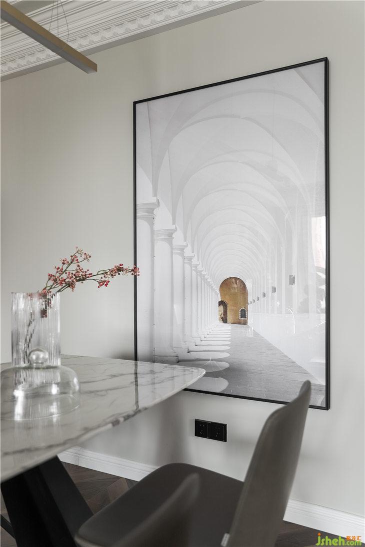 這幅名為“深邃”的裝飾畫,一是遮蔽了畫背后的強(qiáng)弱電箱,二是營造空間拓展的視覺感受,畫面盡頭的那抹彩色,提亮了空間,延伸了視角。