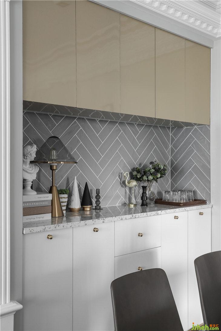 餐邊柜,我們用了分色處理,下柜啞光白色烤漆門板,并單配金色球形小把手,提升精致感,吊柜,我們選用了金屬香檳色門板和柜體,更加易于打理,同時(shí)與下柜的把手形成呼應(yīng)。