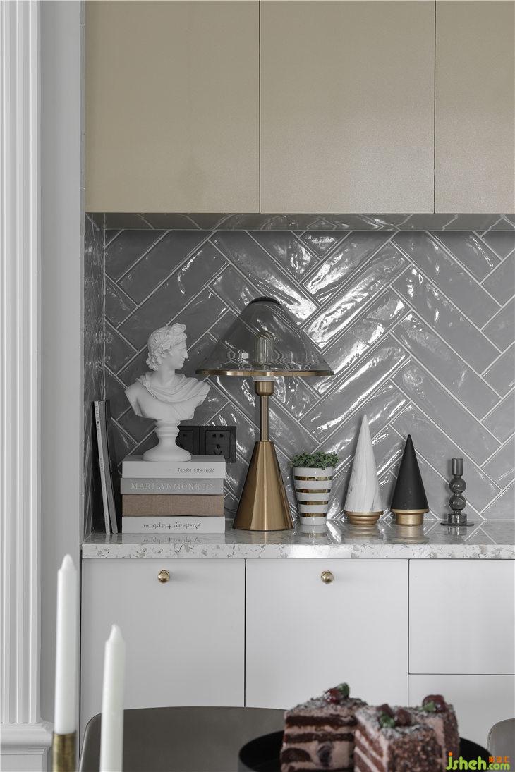 吊柜下口內(nèi)置了燈帶,方便爺爺奶奶起夜喝水使用,灰色凹凸釉面的長條面包磚,進行人字鋪貼,自然的圍合了餐邊柜,這里不光是一個簡單的柜子,也是承載了家人起居生活很重要的功能。