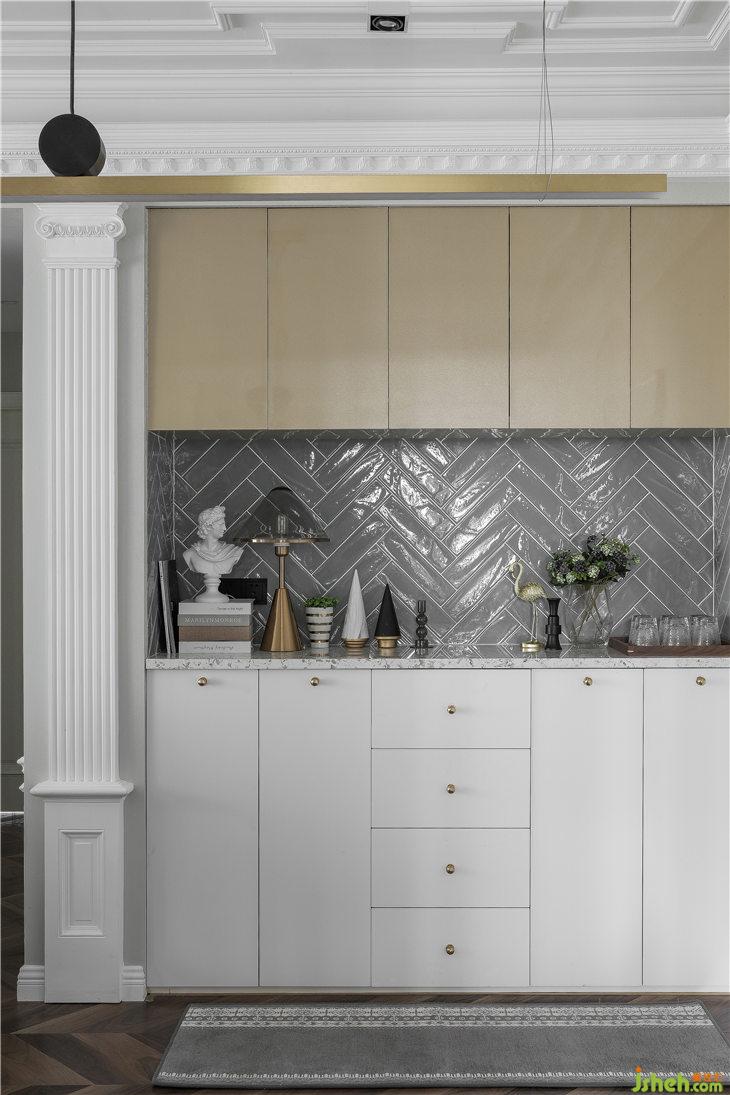 餐邊柜旁的墻體是結(jié)構(gòu)柱,拆除不了,所以一個復(fù)古羅馬柱作為裝飾彌補了這個寬面的空缺,又很好的融入了整體復(fù)古的調(diào)性當(dāng)中。