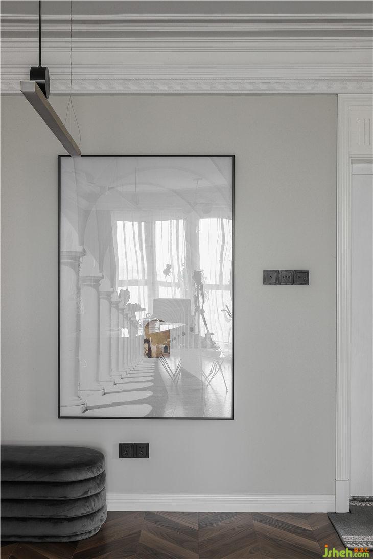 過道中的復(fù)古裝飾畫組合富有現(xiàn)代懷舊的詩意之美。