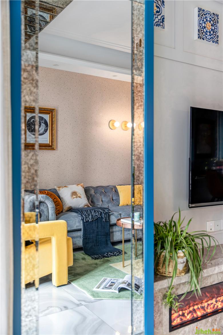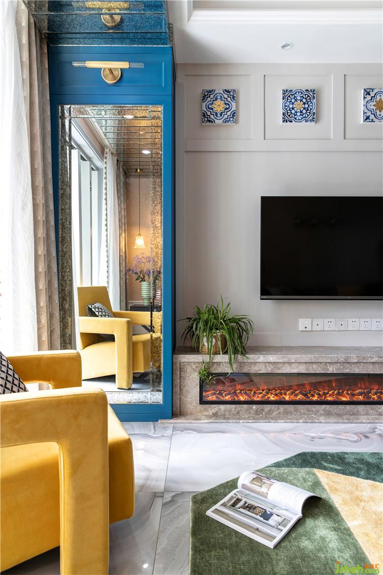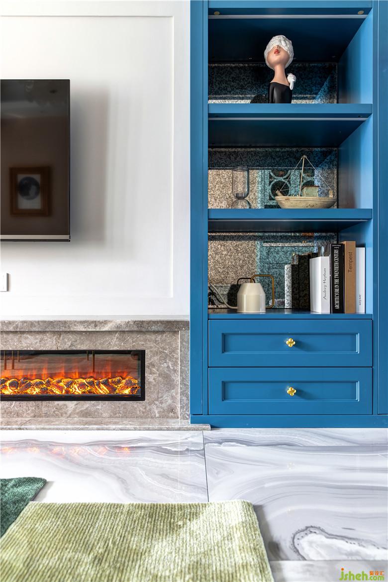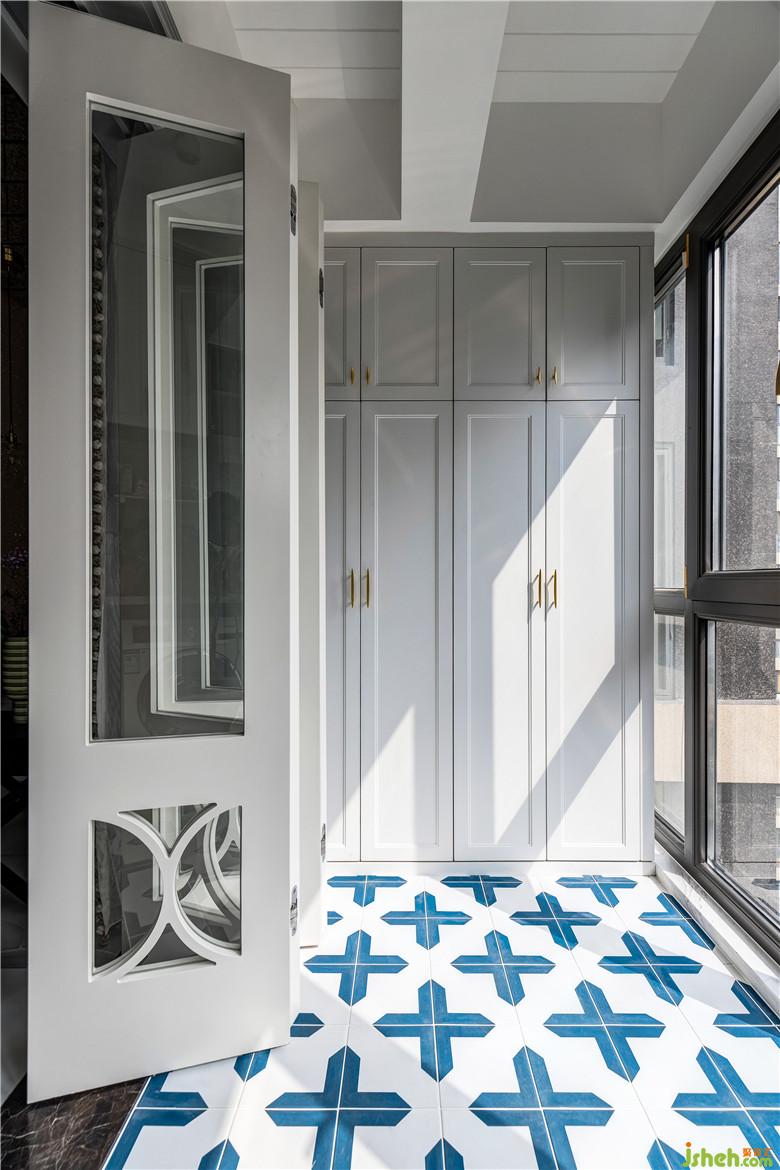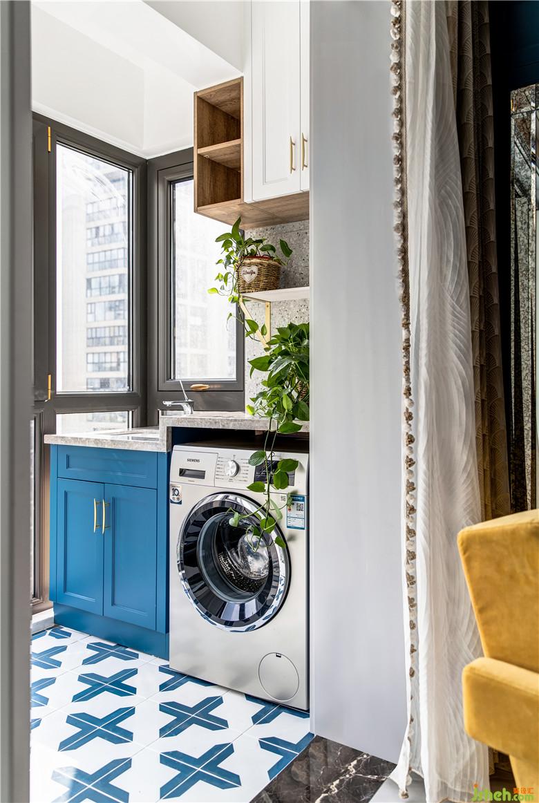 陽臺一側(cè),洗漱池與洗衣機臺面高低錯落,頂部有效的空間都定制了收納柜,顏值與功能兼得;地面選用藍(lán)色系拼花地磚,呼應(yīng)整體色調(diào)。