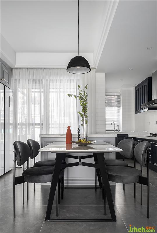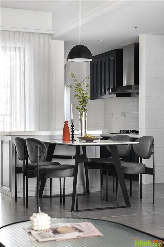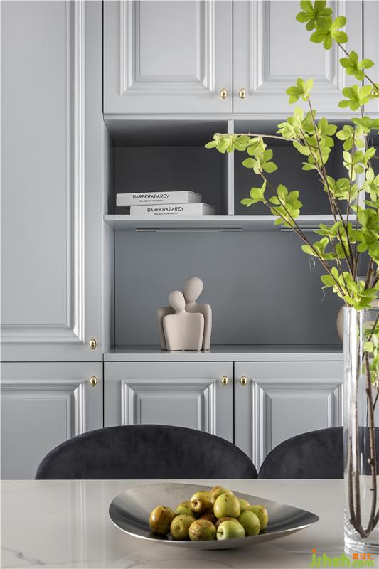 餐廳與生活陽臺(tái)相連,采光十分通透。餐柜的設(shè)計(jì),不僅解決了最基本的收納問題,而且還提前預(yù)留了一個(gè)冰箱位,加上利用矮柜布置的操作臺(tái),實(shí)現(xiàn)了強(qiáng)大的使用功能。