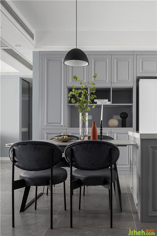 餐桌椅簡約而不簡單,深色的結(jié)構(gòu)有著美式獨(dú)有的沉穩(wěn)氣質(zhì)。線條感十足的美式柜子,再輔以裝飾畫和桌面的綠植插花,就餐氛圍瞬時(shí)優(yōu)雅起來。