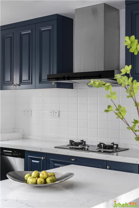 來到廚房,清新的色彩搭配耳目一新。簡約的櫥柜搭配淺色墻磚和石英石臺(tái)面,經(jīng)典而耐看。