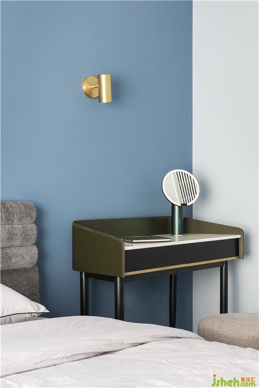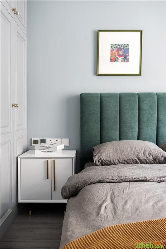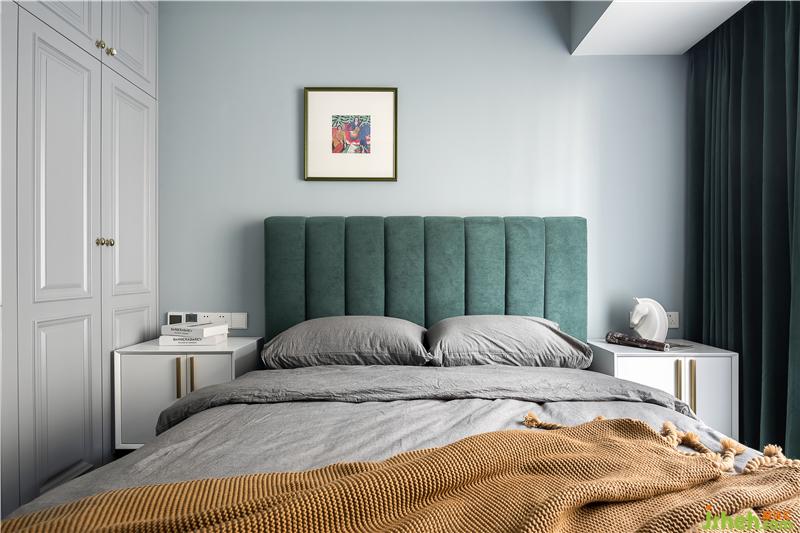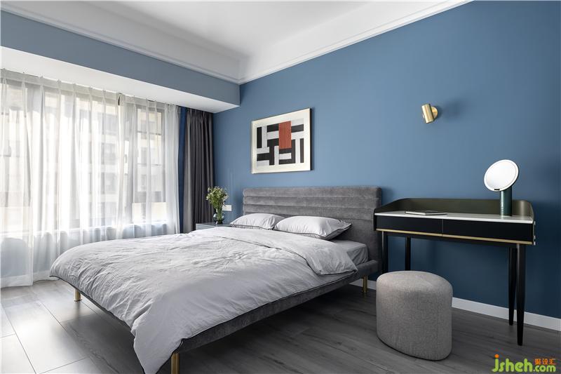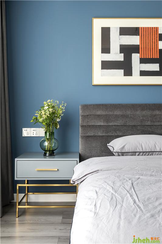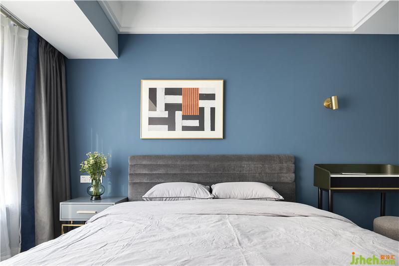 藍色的背景墻加上簡約的裝飾畫,清新而大氣。深色的簡約大床呼應(yīng)睡眠空間的整體風格,更顯穩(wěn)重大方。