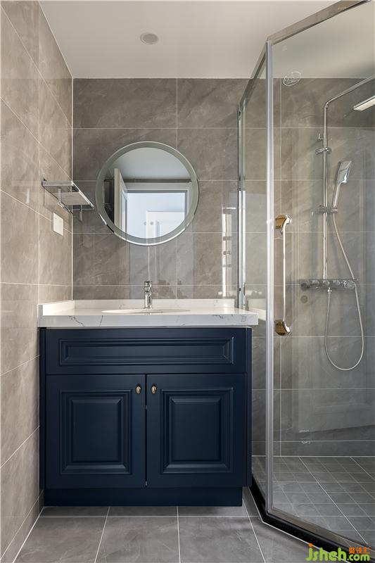 衛(wèi)浴空間墻面鋪滿魚骨形狀瓷磚,結(jié)合圓鏡和藍色的抽屜柜,優(yōu)雅之感應(yīng)運而生。