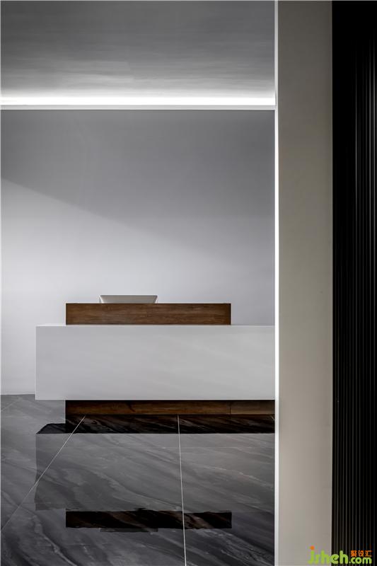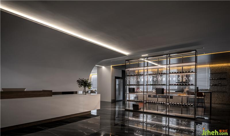 前臺頂面整墻的弧形石膏板吊頂,整個空間線條流暢,頗具設計感。右邊紅酒柜將空間分離又自帶修飾美感。