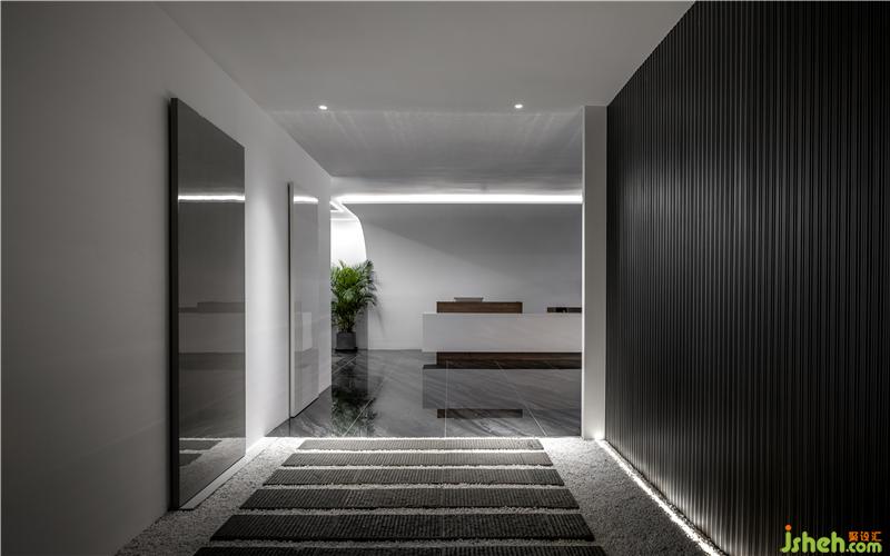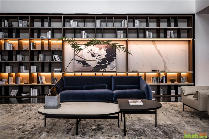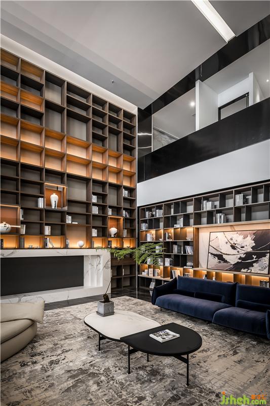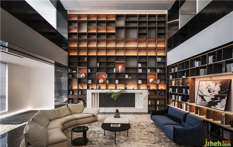 高7米、寬6米的巨型電視墻是會客廳最吸睛的存在,柜體采用隱藏連接工藝,多層次平面組合,看似不規(guī)則又有規(guī)律的燈光為整壁柜子增添了不少色彩。