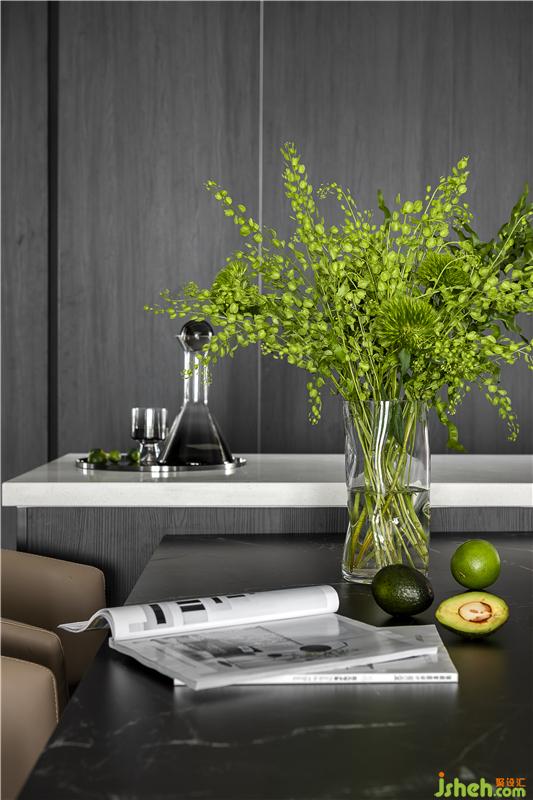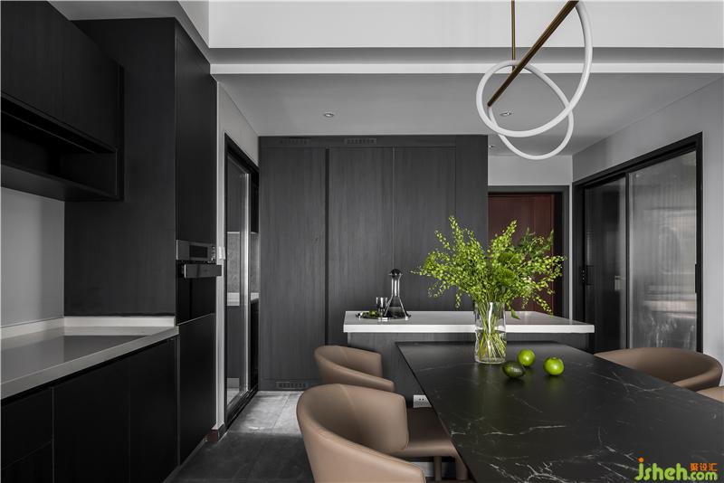 餐廳與西廚結(jié)合在一起,餐桌連接島臺,方便操作,也增加時尚感
