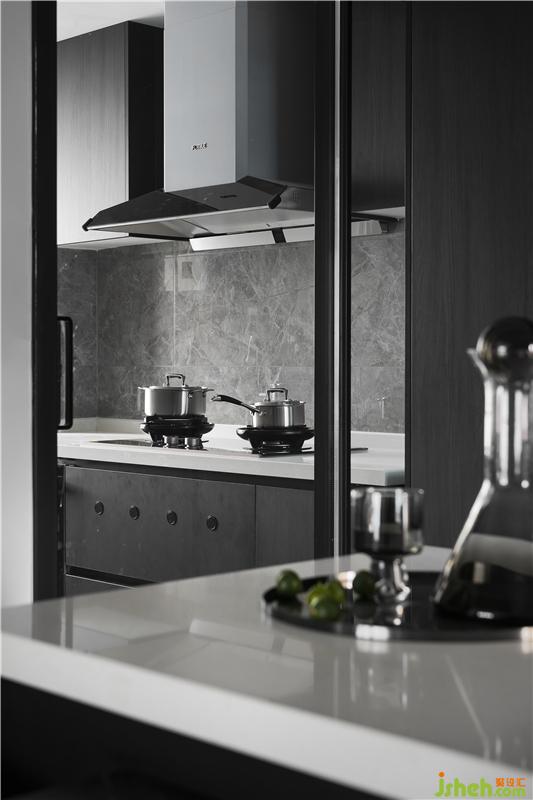 將冰箱、蒸箱嵌入柜體中,風(fēng)格形成統(tǒng)一,整個空間整潔干凈。