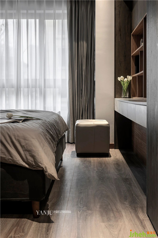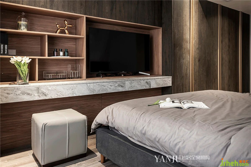 在床尾衣柜的設(shè)計(jì)上,巖居設(shè)計(jì)打造了一個(gè)集收納、梳妝臺(tái)、電視柜等多種功能于一體的設(shè)計(jì)方案,解決了居住者一直以來面臨的臥室收納問題。