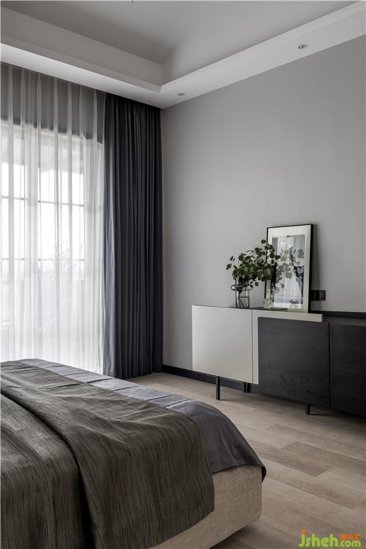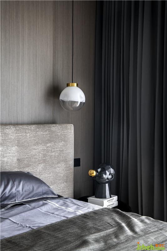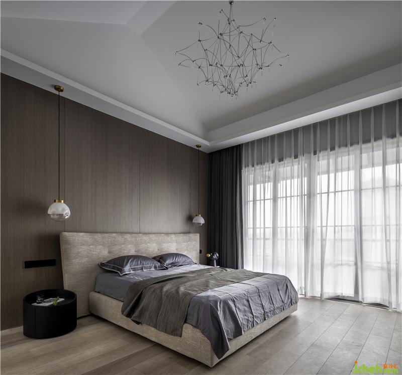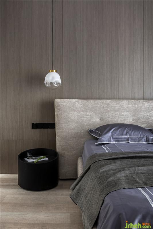 主臥床頭背景墻用了胡桃色木質(zhì)飾面板,搭配淺咖色布藝床,床頭靠背軟包設計,增添舒適感。床頭吊燈設置讓每個夜晚都有一彎明月照亮家里的小角落;大大的落地窗讓陽光更好地灑進來,愜意而美好。