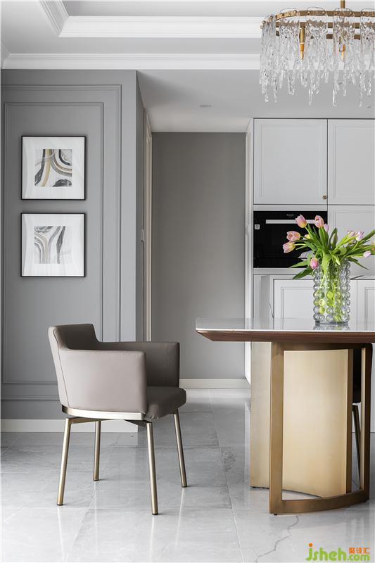 白色水晶吊燈大氣又干凈,結(jié)合金屬材質(zhì)餐桌,餐廳空間輕奢含蓄而不浮夸。