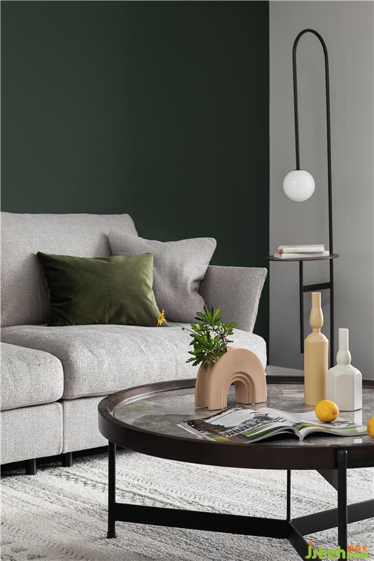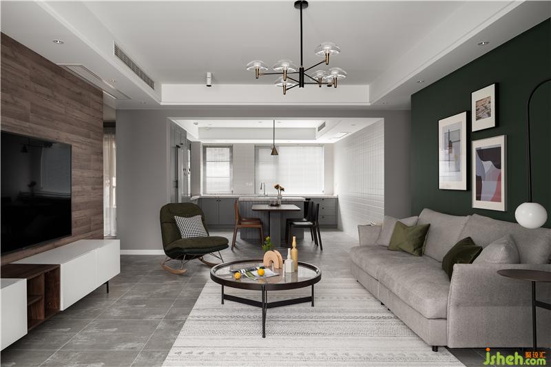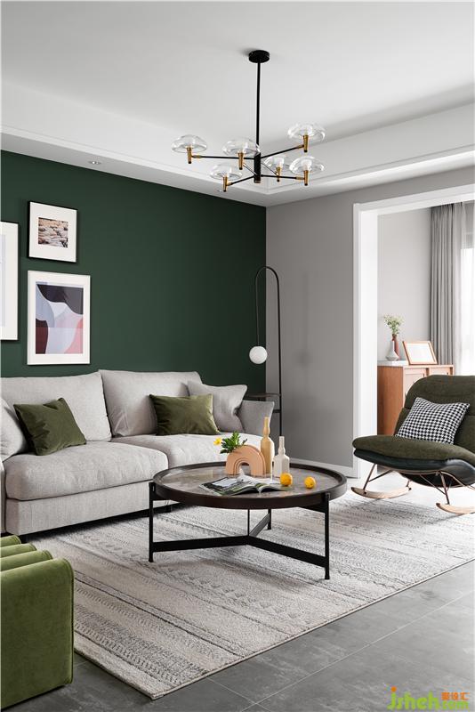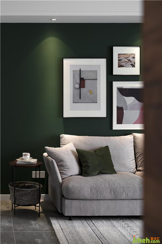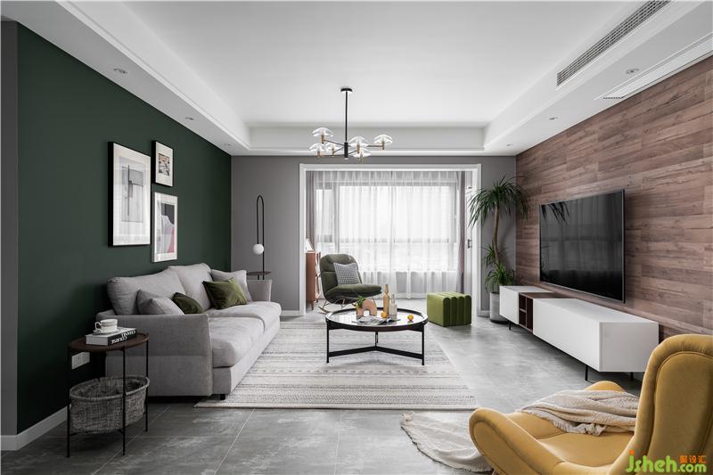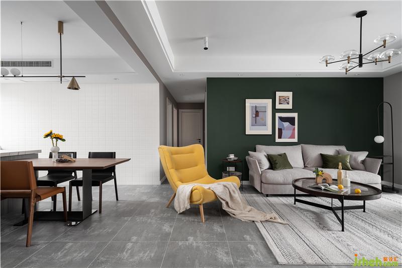 客廳的整體色調(diào)為偏灰色,沙發(fā)背景墻加入了女業(yè)主喜歡的墨綠色,搭配彰顯個(gè)性的黃色單椅,撞色帶來(lái)了不一樣的視覺(jué)美感。