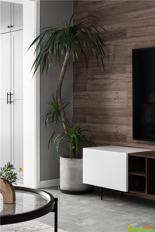 電視背景墻采用了整面的黑胡桃飾面板,與白色電視柜形成鮮明對(duì)比,搭配上充滿生機(jī)的綠植,給人質(zhì)樸清新的感覺(jué)。