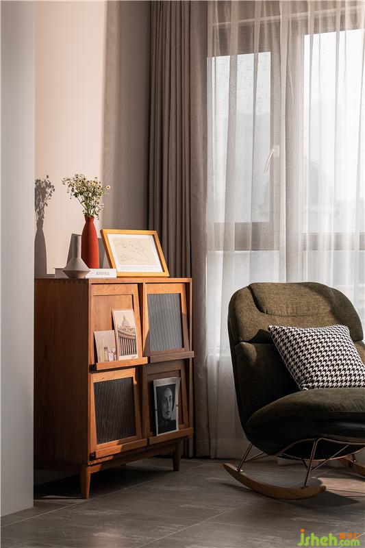 陽(yáng)臺(tái)納入客廳后,客廳空間更加敞亮大氣。午后一抹陽(yáng)光灑進(jìn)來(lái),斜斜地照射在邊柜上、靠椅上,一杯咖啡一本讀物,在這靜謐的休息區(qū)里感受生活的小美好。