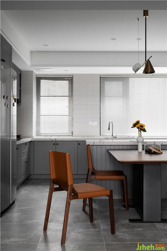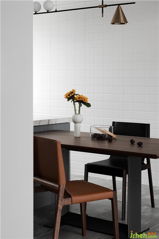 餐廳一邊是白色文化磚,一邊是西廚。開放式廚房打開了整個客餐廳空間,通透大氣。
