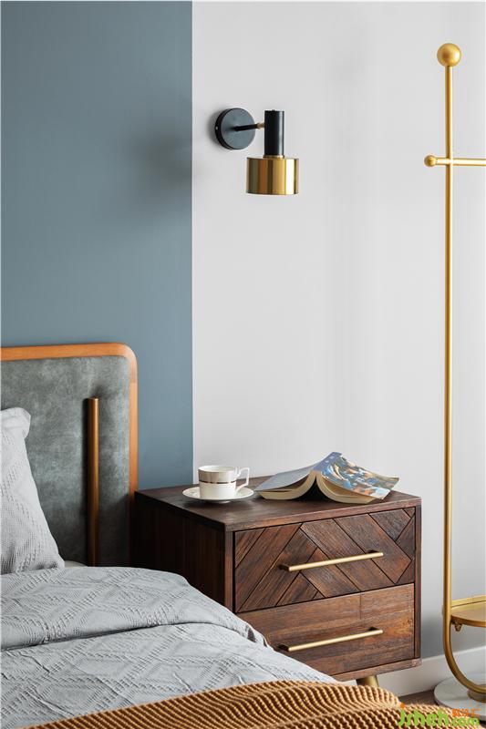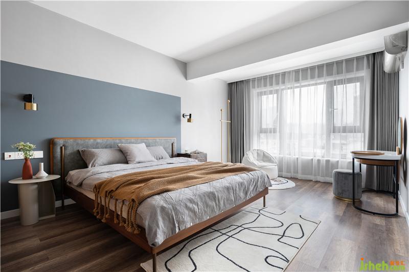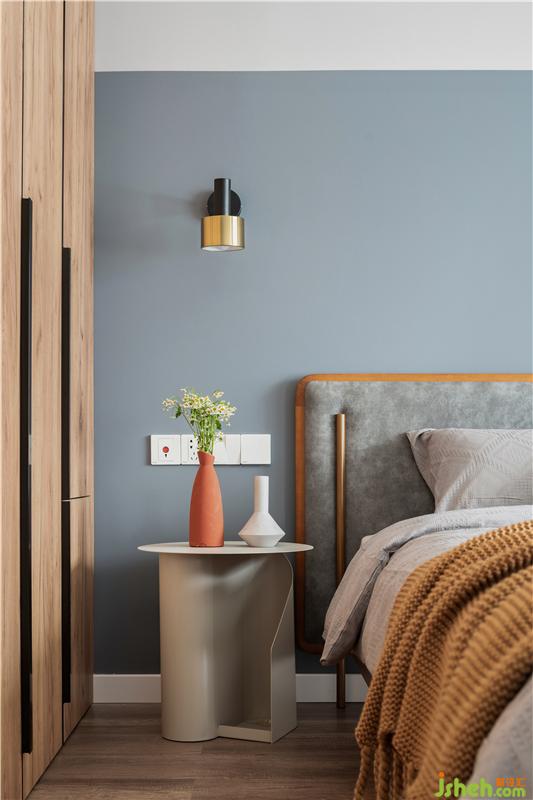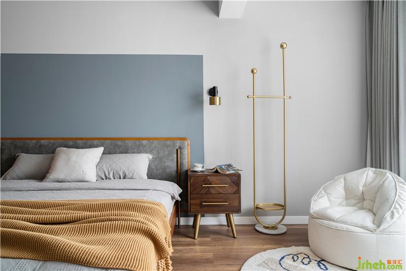 主臥鋪設(shè)木地板,腳感溫和舒適。床頭背景墻運用了小面積灰藍色,清新自然,搭配少許金屬材質(zhì)的軟裝單品,整個空間家居設(shè)計精致而富有情調(diào)。