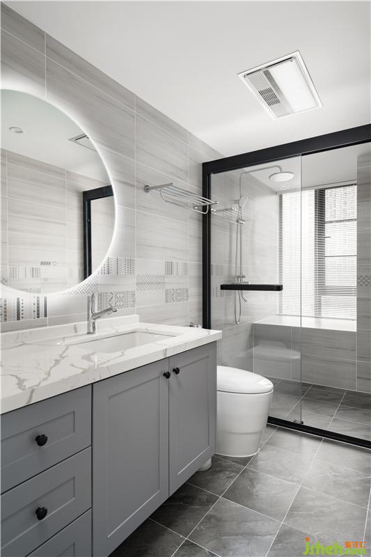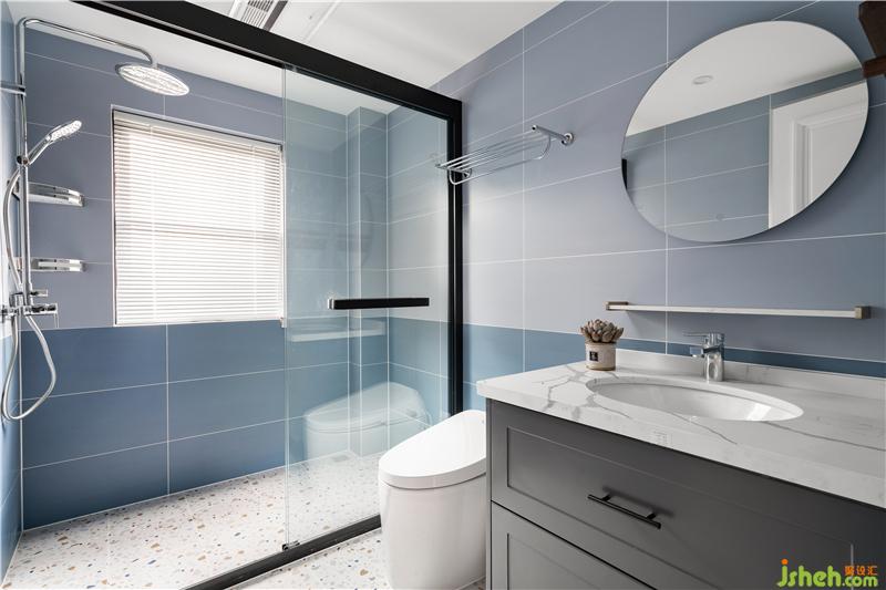衛(wèi)浴空間實現(xiàn)了干濕分離,小面積藍色與主臥呼應(yīng),地面的小花磚增添了衛(wèi)生間的趣味,整個空間顯得整體統(tǒng)一。