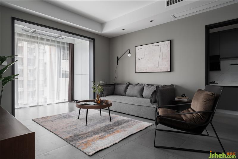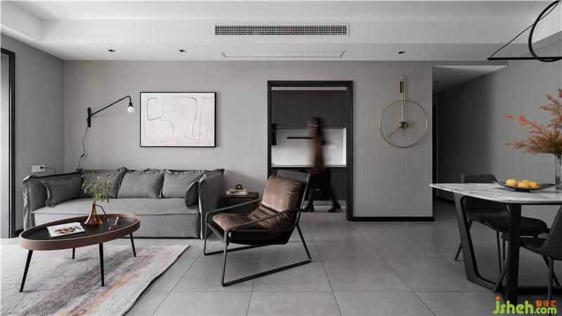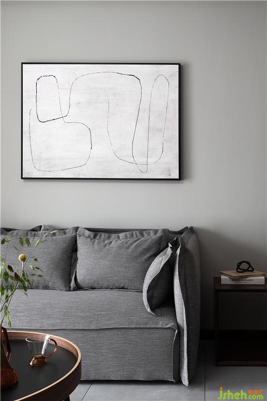 淺灰色沙發(fā),輔之一把棕色單椅,沉穩(wěn)的氣場直接hold住全場,再加上現(xiàn)代感很強(qiáng)的掛畫和黑色金屬壁燈,整個客廳裝修設(shè)計(jì)彰顯著簡約藝術(shù)的氣息格調(diào)。