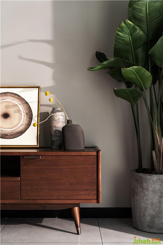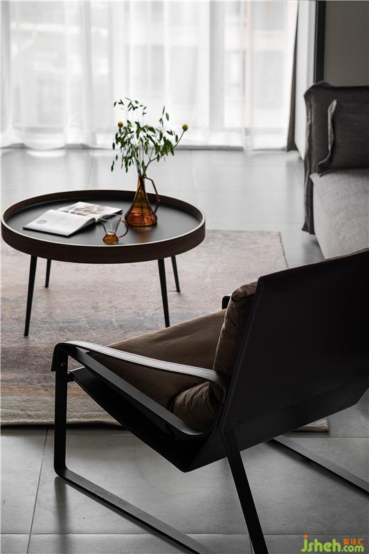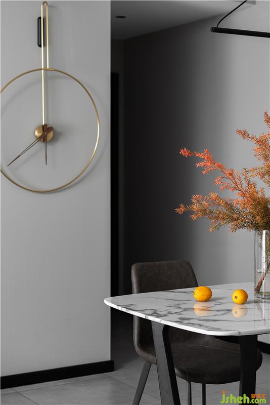 客廳的大落地窗讓室外的景色透進(jìn)來,整個空間更加明亮、通透。泡上一壺茶,用心感受遲暮與朝霞的魅力。懸掛在墻上的圓形個性裝飾鐘,為客廳平添了一絲藝術(shù)氣息。