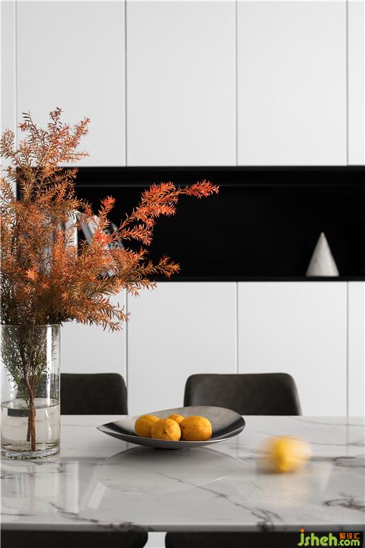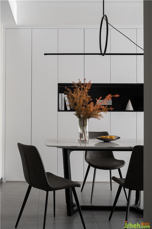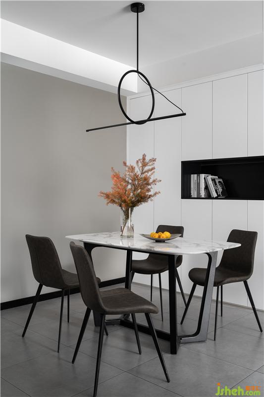 幾何一字型創(chuàng)意藝術(shù)吊燈簡潔又不失大方,裝修設(shè)計(jì)搭配大理石餐桌,更具活力。餐邊柜與儲物柜結(jié)合,既能作為家庭儲物收納也能作為飾品展示區(qū)域,美觀實(shí)用。