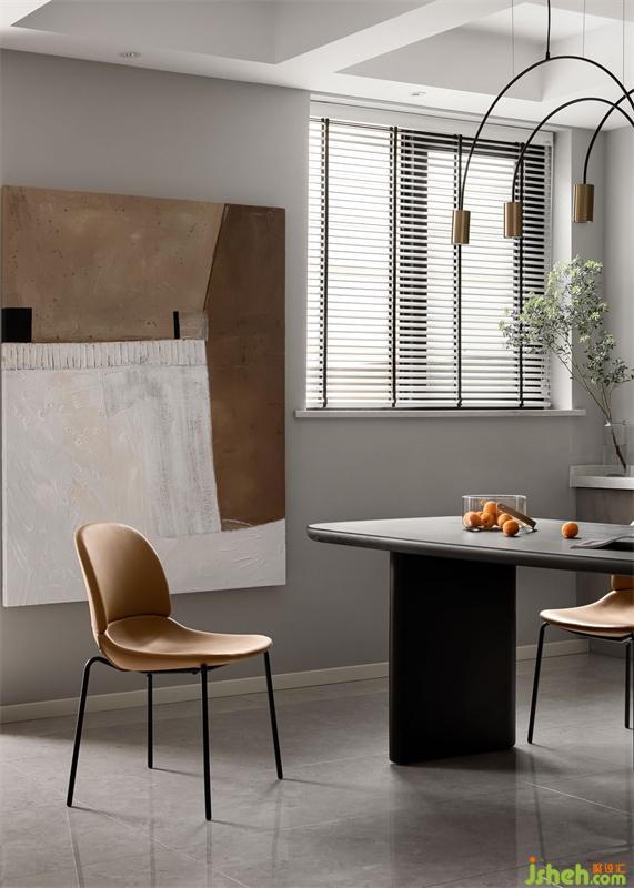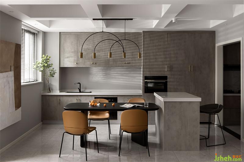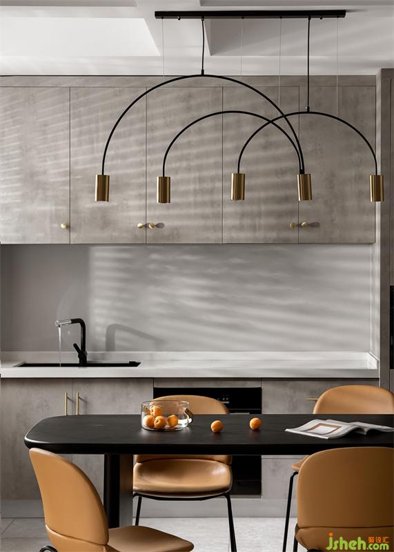 “島臺(tái)+餐桌”的設(shè)計(jì),時(shí)尚又大方,橙色桌椅搭配灰色餐桌,總是會(huì)讓人忍不住多看兩眼,弧形的吊燈,提升了空間的質(zhì)感,簡(jiǎn)約不簡(jiǎn)單。