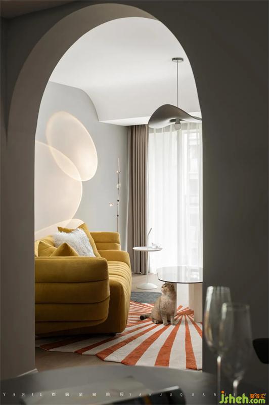 拱門的設計讓光源充分引入餐廳,整屋大量使用業(yè)主喜歡的金色、藍色、黃色元素,視覺上鮮明而不過分耀眼。