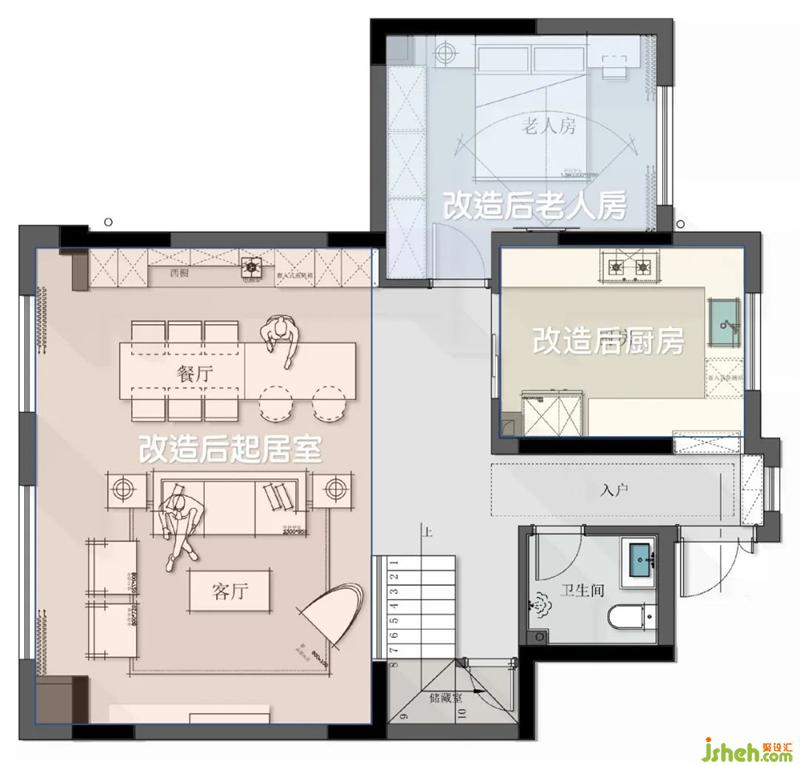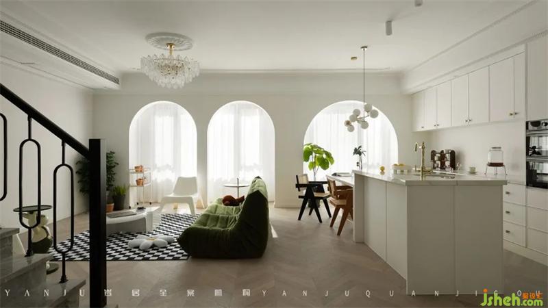 復(fù)式設(shè)計(jì)客餐廳保留了原始的橫廳結(jié)構(gòu),拆除了原有飄窗,改為三個(gè)拱形門洞,增加光影結(jié)構(gòu)和層次感,為兩個(gè)寶貝打造了一個(gè)可以躲貓貓的童趣空間;同時(shí)取消了電視柜和茶幾,給小朋友留下足夠的玩??臻g。