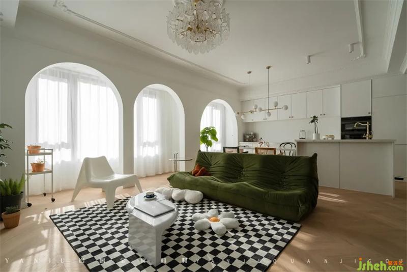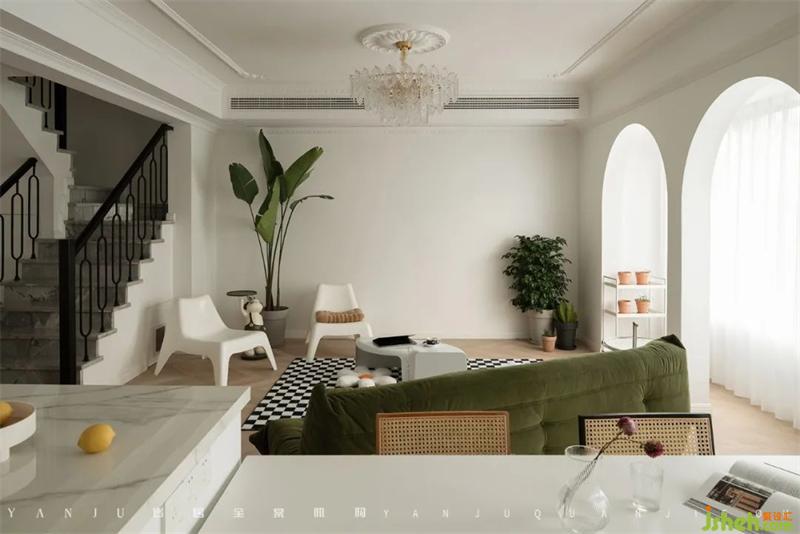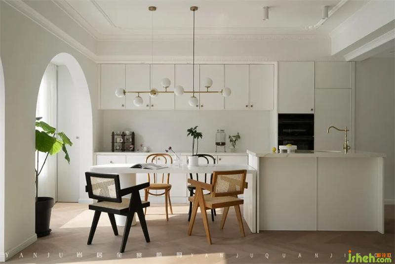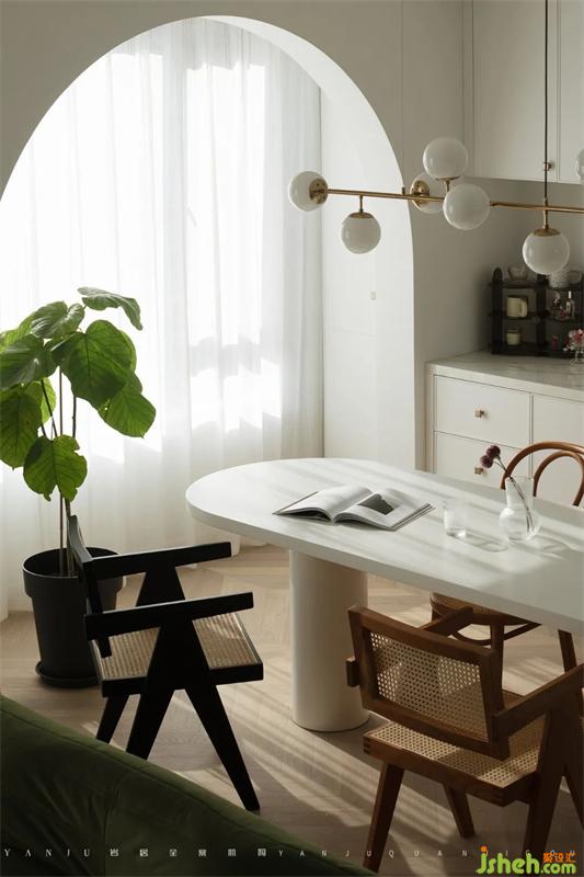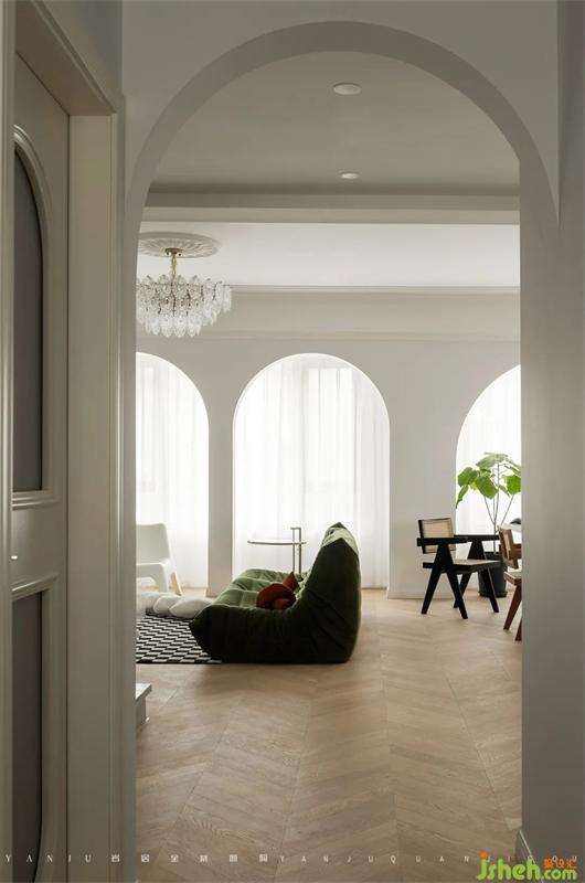 連接玄關(guān)與客餐廳的門洞設(shè)計(jì)成了拱形,與客廳的造型相呼應(yīng), 增添空間的層次感和古典韻味。