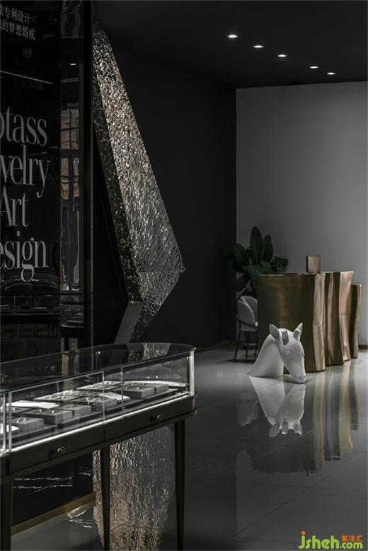 The function of the front hall, different from the traditional commercial display cabinets, is served as a area for customer reception and tea break. Sofa sets and seats are set along the side of the French window. The comfortable scene clearly distinguishes customized services from traditional business models. The ceiling decoration is a perfect combination of point, line and surface elements. The designer puts the light belt around the column in an irregular line shape, and the red light diffuses on the metal corrugated plate, artificially dispersing the light. The flowing light falls on the jewelry on display, highlighting the sparkling texture of diamond.