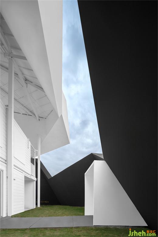 美術(shù)館設(shè)計(jì)改造過(guò)程中,建筑外部空間有了顛覆性的創(chuàng)新表現(xiàn)。圍繞原有的三個(gè)集裝箱式的鐵皮建筑,基礎(chǔ)的幾何形體結(jié)構(gòu)在二維及三維空間中相互穿插切割,形成散落于空間中的造型,且由此劃分出不同區(qū)域。