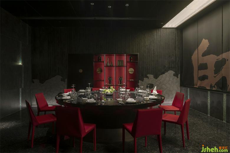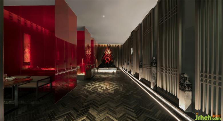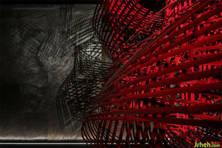 When entering the art corridor you’ll find a picture of sparse bamboo and moonlight shadow. The designer takes bamboo as raw material, and makes the hanging decoration of bright red geometry with artistic atmosphere. The modelling reflection of extremely rich visual tension is on the mirror surface wall, so that the light has the poetic charm.