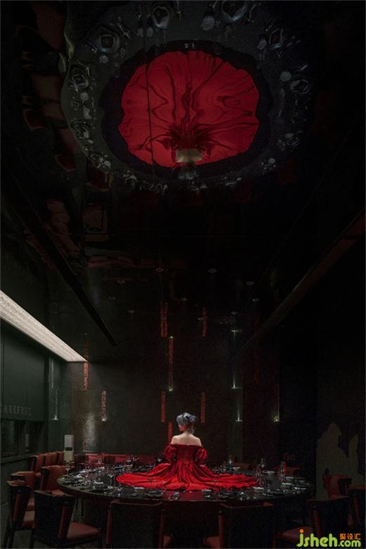 藝術(shù)走廊呈現(xiàn)出一幅“疏竹月影”的圖景,成都餐廳設(shè)計(jì)師以四川盛產(chǎn)的竹子為原材料,定制成極富藝術(shù)氣息的大紅色幾何形吊飾。極富視覺張力的造型反射在鏡面墻壁上,疏落有致的的照影自有一番落月?lián)u情的詩韻。