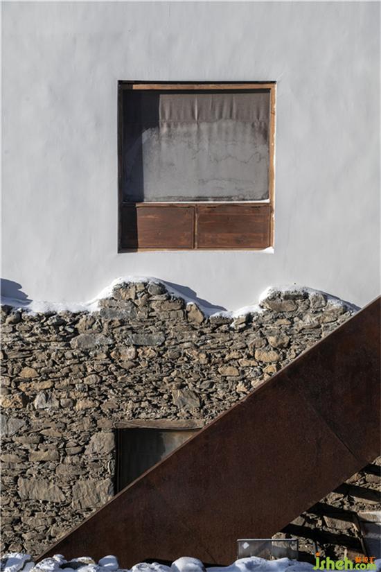 在整體民宿的一層,雅拉野奢溫泉民宿設計師保留了原有藏民民居的石砌結(jié)構(gòu)和木質(zhì)立柱,盡可能地將它們身上的歷史印跡延續(xù)下去,讓每一位居者都能奢享山野之中的原始風味。在部分斷墻處,用現(xiàn)代白色涂料加以銜接,在原始與現(xiàn)代的對比和交融中,刻畫出時光流動。