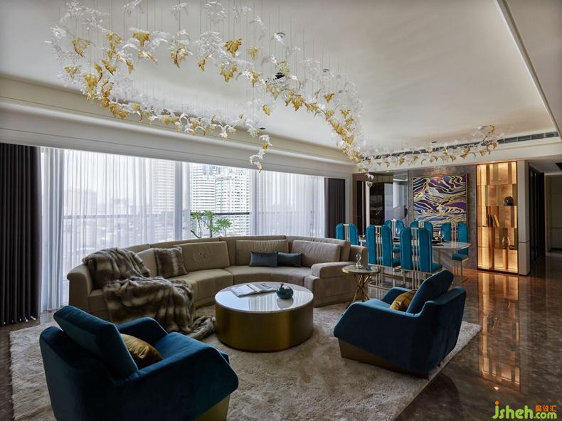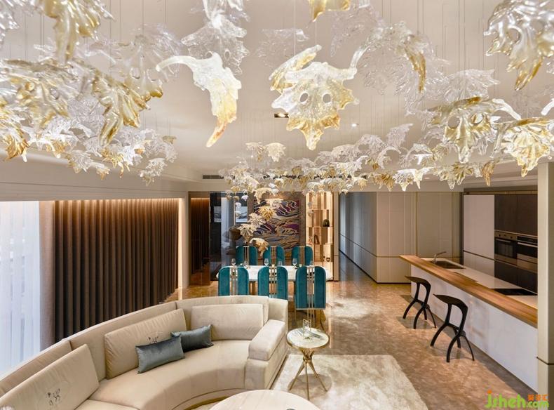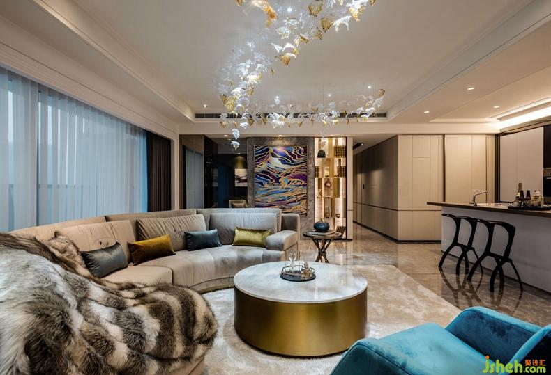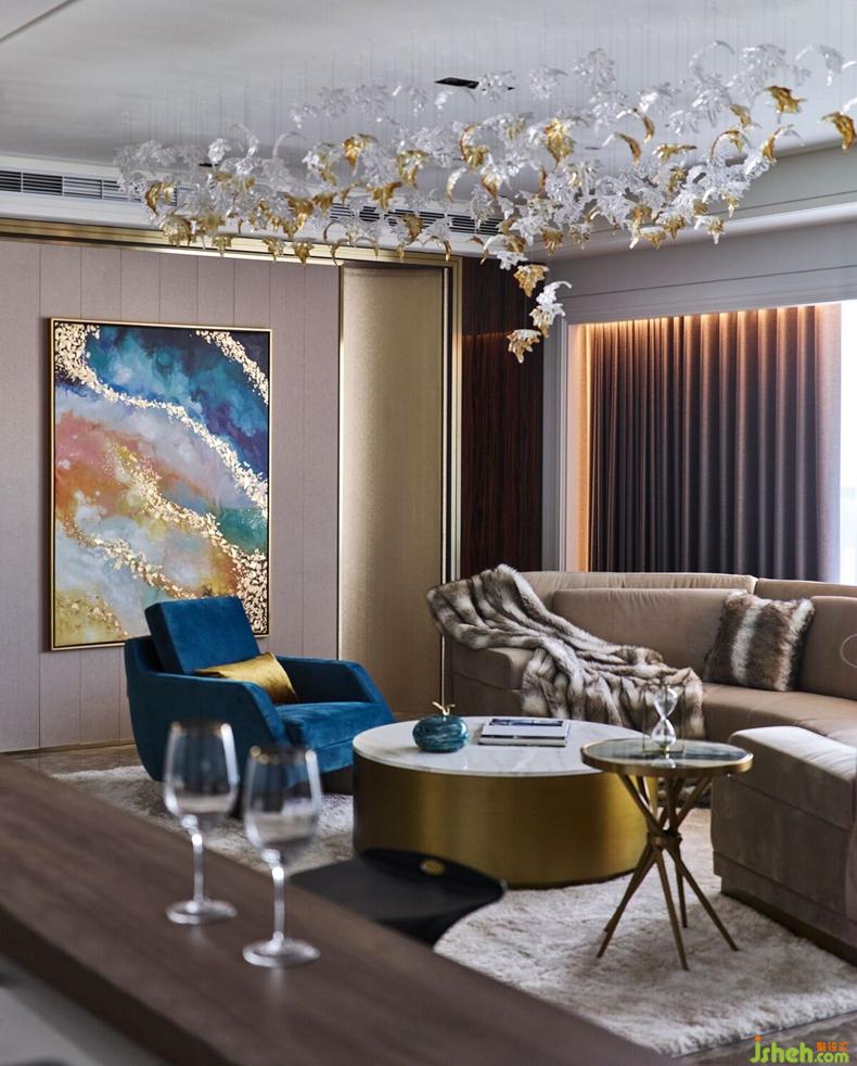 甫推開大門,手工精雕屏風(fēng)半掩玄關(guān),神秘奢華,隱藏不住該空間展示時(shí)尚意圖。金黃色夕陽透過大片落地窗灑落進(jìn)入客廳,反射在皮革家具上更顯斑斕奪目,空間色彩隨之緩緩流動(dòng),開啟與藝術(shù)品對(duì)話、以及當(dāng)代住宅設(shè)計(jì)的實(shí)驗(yàn)。