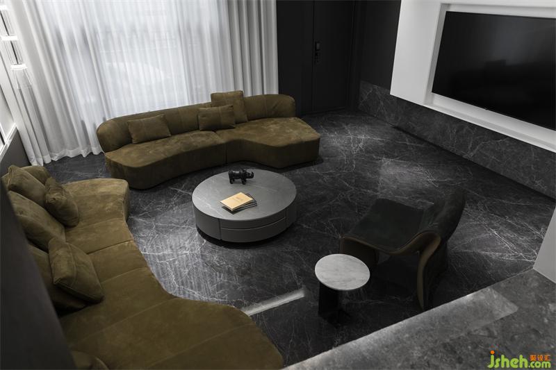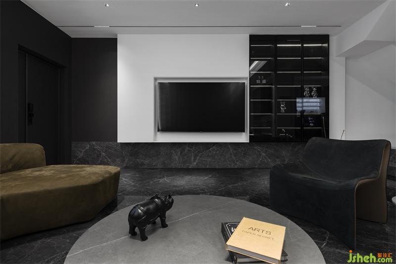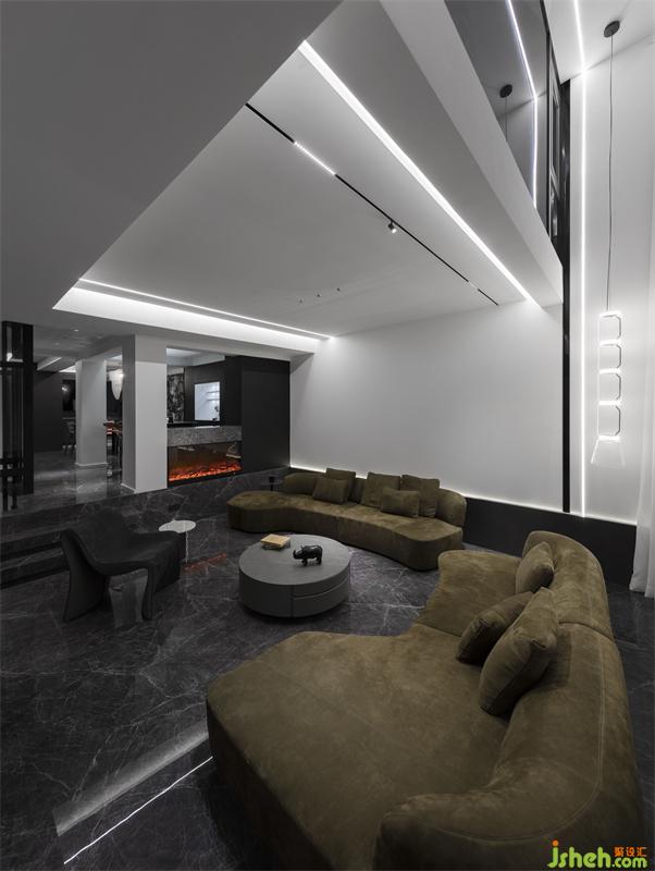 本案打破別墅原有建筑外觀的局限框架.結(jié)合居住的生活需求,從空間的營造上出發(fā)?,F(xiàn)代元素的既簡手法。會客廳的下沉式結(jié)合部分挑空。圍合感十足。即保留外建筑原有的弧形窗不被功能的抵用而有所破壞,同時(shí)增加了空間的合理利用,高低位收口輔助天際線的穿梭連貫,拉高了視覺上會客廳的高度,別墅設(shè)計(jì)保留原有別墅高廳的味道,又增加了2樓房間的懸浮感。