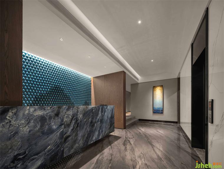 踏足大堂,酒店設(shè)計大堂空間的視覺亮點(diǎn)——碧藍(lán)色陶瓷墻畫是嶺南天地脈絡(luò)的抽象寫意,運(yùn)用藝術(shù)的手法,自然山水宛然若畫,光影交相輝映中,不著痕跡地開啟人文體驗。
