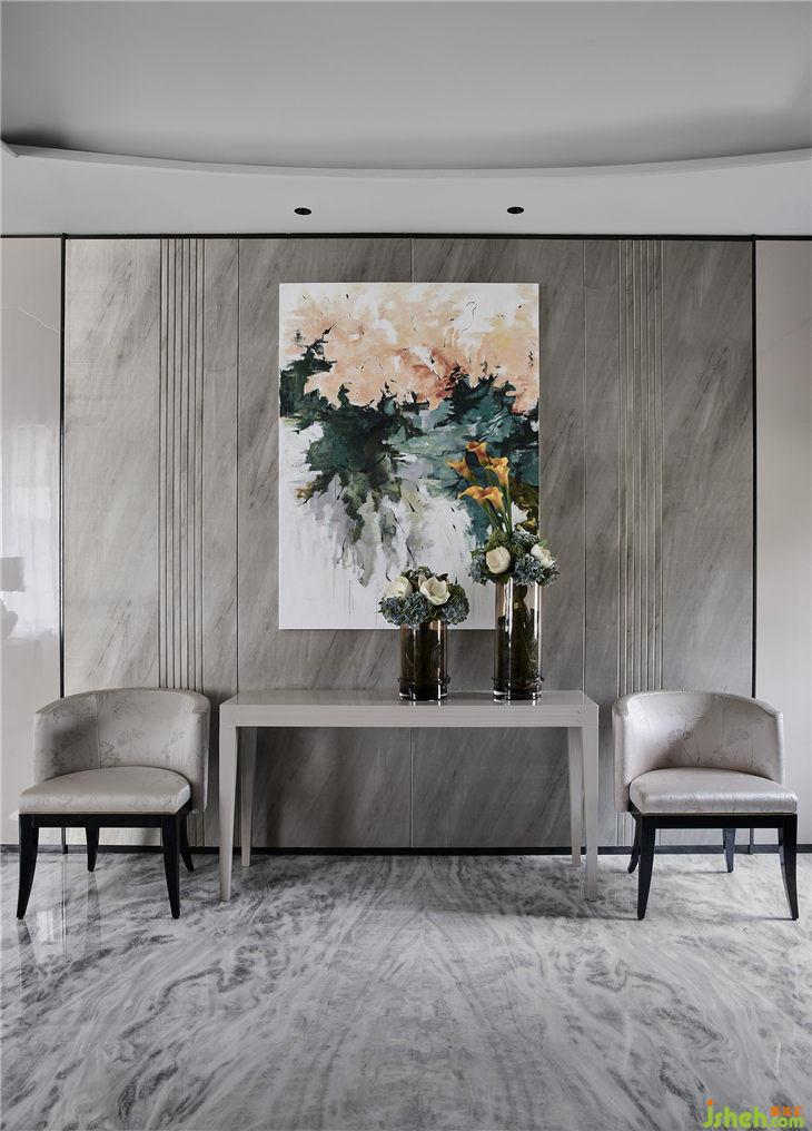 前廳進(jìn)門(這是原先單套的客廳位置),映入眼簾的是一幅色彩變幻的抽象藝術(shù)畫,高雅大氣的花卉在其間若隱若現(xiàn)地浮動起來,延伸開來的是時而大面積分布、時而細(xì)膩如絲的大理石灰地面,將對稱性、平衡性與現(xiàn)代審美的創(chuàng)新性融入其中,展現(xiàn)著一場純粹的人與空間之間的靈魂對話。