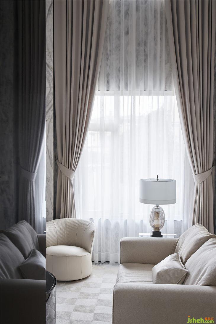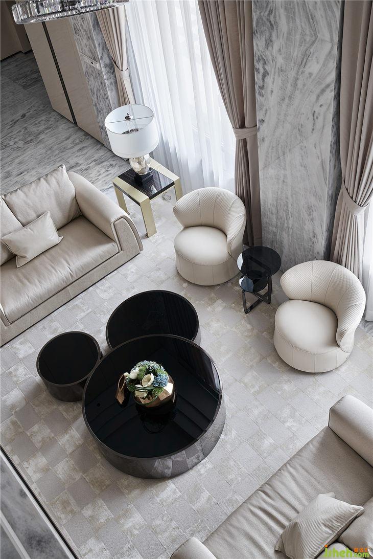 隨之進(jìn)入客廳(這是原先兩套個自的門廳位置),中空挑高的設(shè)計帶來絕佳的視覺感官,落地窗承接著陽光的洗禮,極具流動線條感的大理石墻面,使整個空間干凈簡潔,呈現(xiàn)出雋永典雅的風(fēng)格。米色系的多人沙發(fā)和窗簾,黑曜石般的角幾和茶幾,在自然光線的映射下產(chǎn)生鏈接,注入格紋狀的淺色系地毯,詮釋著極致奢華的當(dāng)代風(fēng)格。