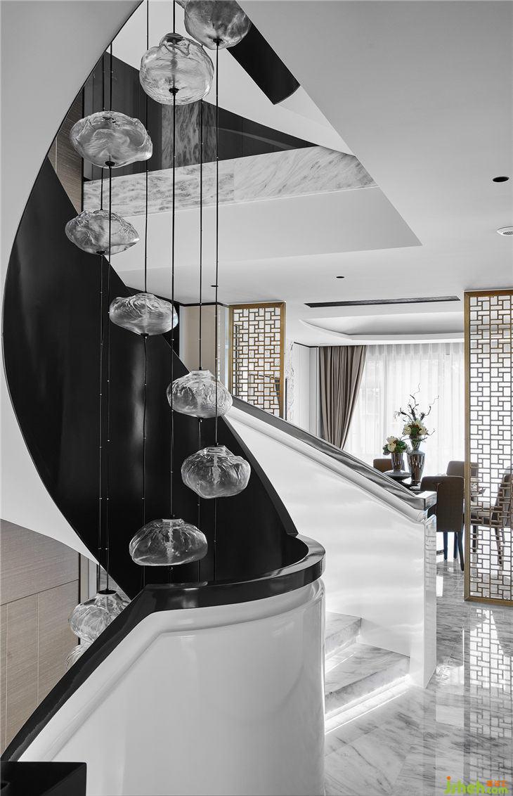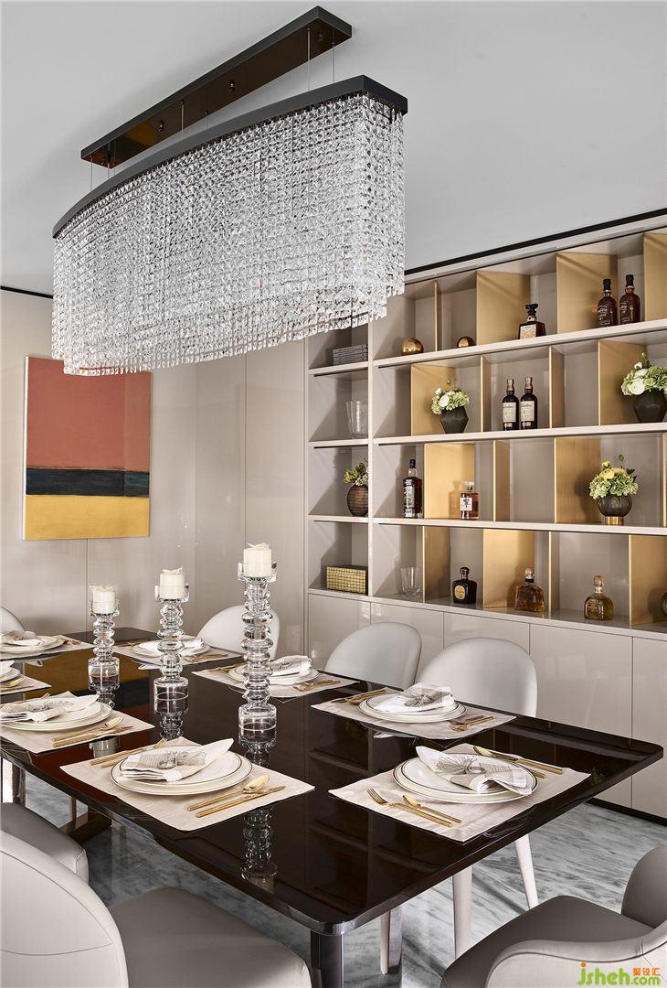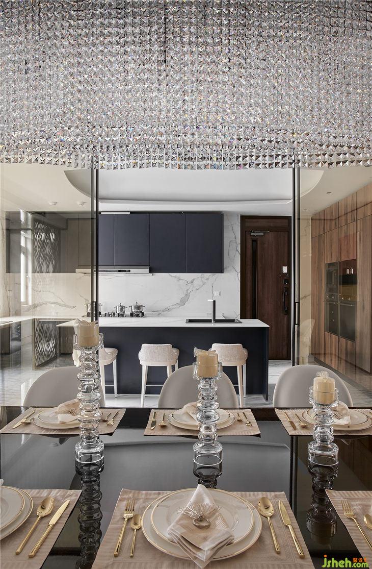 餐廳延續(xù)了客廳的配色材質(zhì),使整個空間更顯開闊寬敞,伴隨著似滿天星辰般的燈飾緩緩垂落,與暖色透明的玻璃門遙相呼應,讓整個空間更富有當代感染力與藝術(shù)表現(xiàn)力。