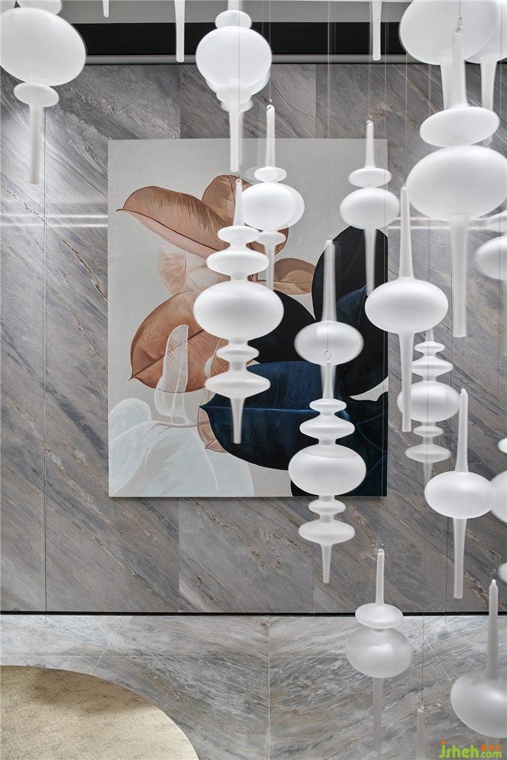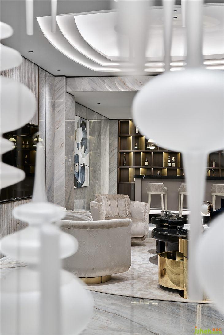 幾何異形的燈飾為引導(dǎo),開始進入新的空間,在層層遞進的過程中,流動的線條、藝術(shù)的燈飾、撞色的擺件將整個地下休閑室展現(xiàn)在眼前,藍色沙發(fā)代表著高貴與從容,時尚與夢想,使整個空間越是簡單,越是豐富。
