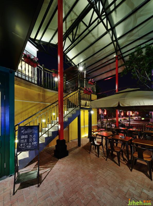 建筑原身是由四節(jié)顏色不同的集裝箱疊加而成,地處城市創(chuàng)意園區(qū),周邊環(huán)繞著紅磚建筑。初見(jiàn)時(shí),幾節(jié)集裝箱在周邊復(fù)古環(huán)境的映襯下顯得突兀式的現(xiàn)代,文化感不夠濃郁。