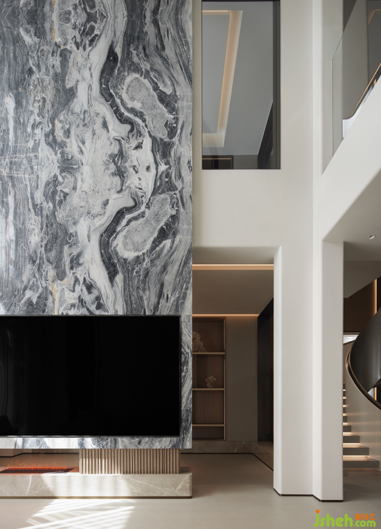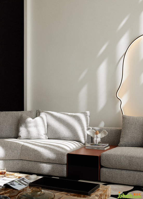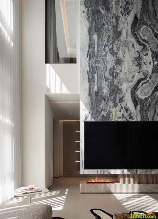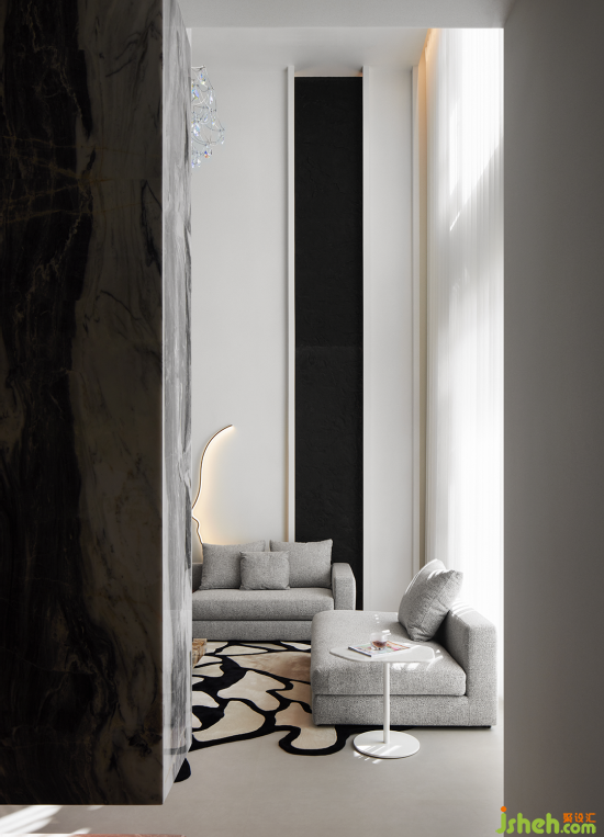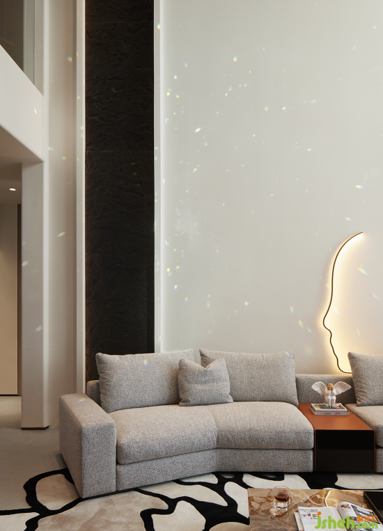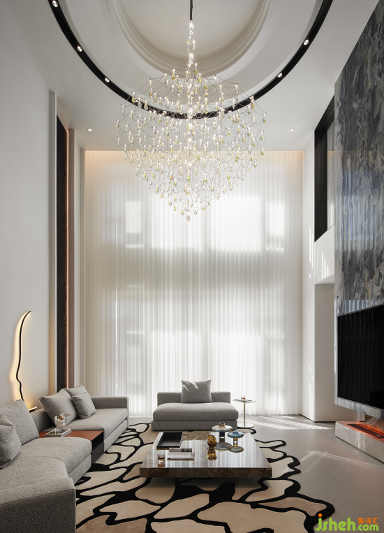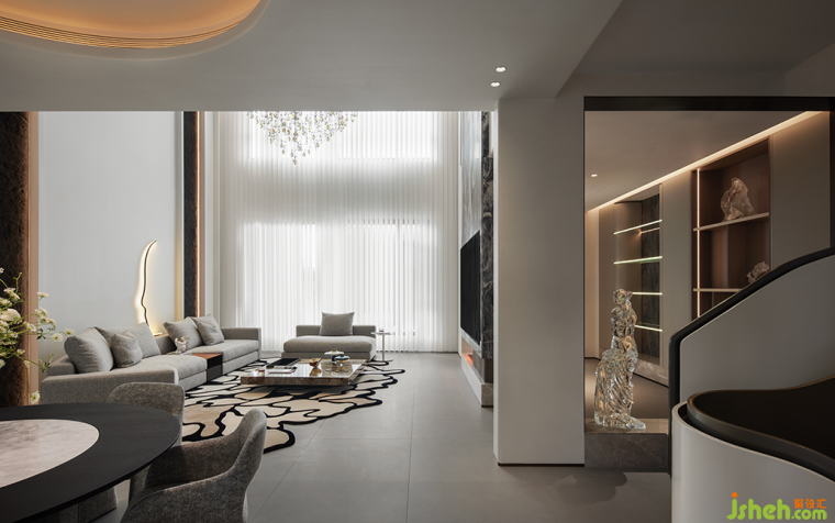 入戶歸家的氛圍充盈著白與灰低飽和但高級的色調,結合簡潔的構建線條,渲染出奢雅純粹的美學領域。晶瑩剔透的水晶吊燈聚焦空間,層疊映射的光圈平添了一抹詩意的驚喜。