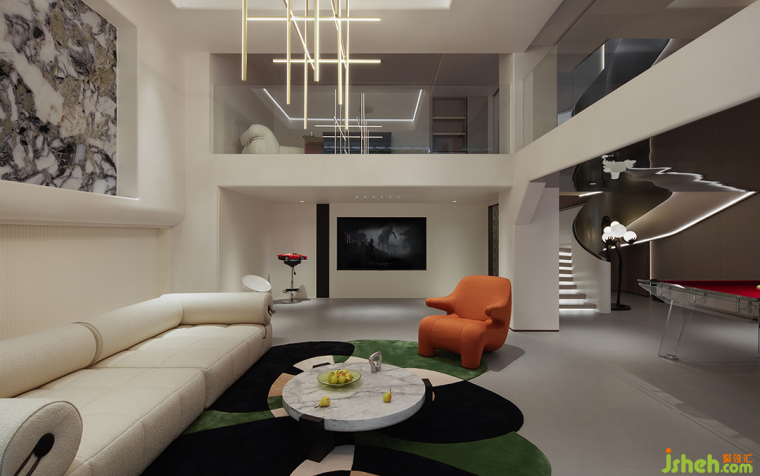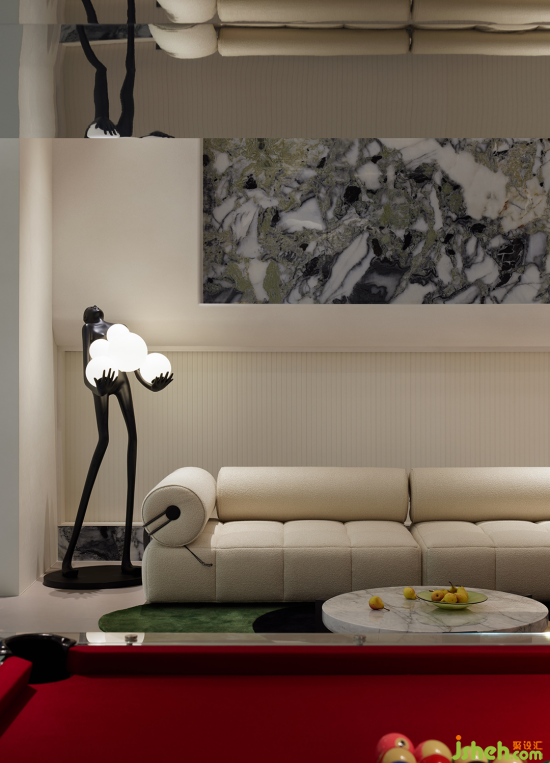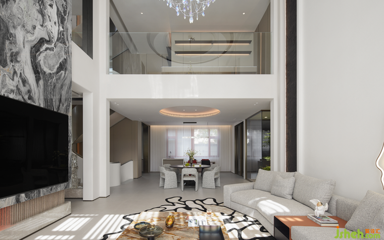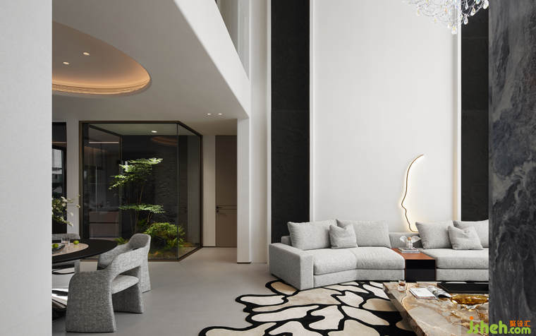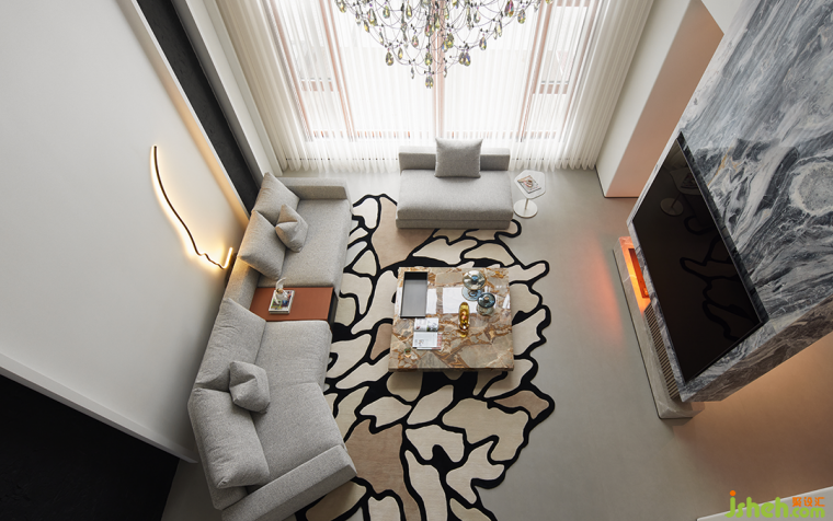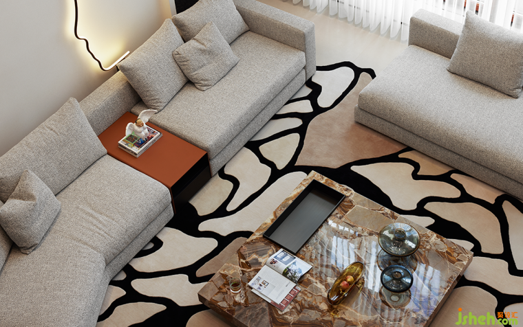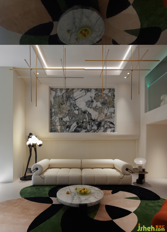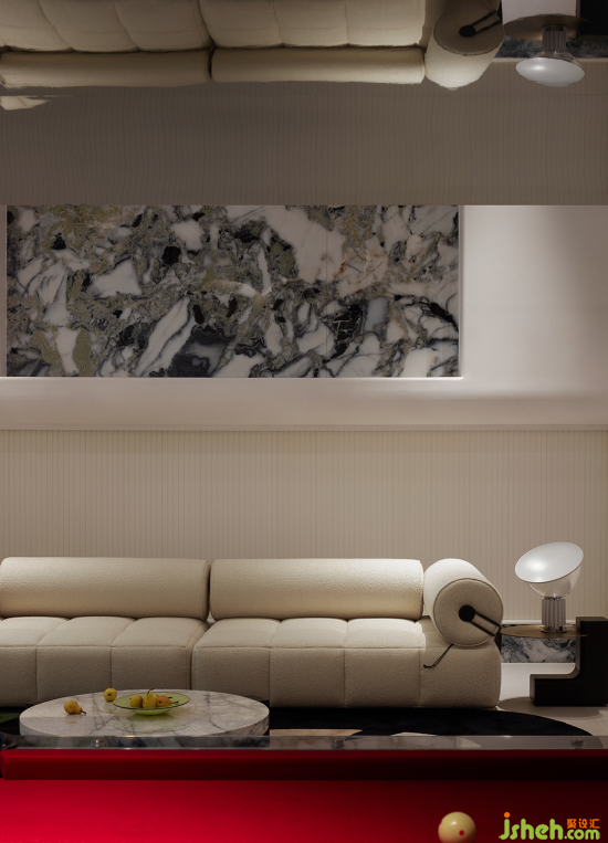 大理石背景照壁、不規(guī)則藝術拼接地毯和石質方正茶幾薈萃多重質感,豐富了空間層次,激發(fā)出更多蓬勃生機。